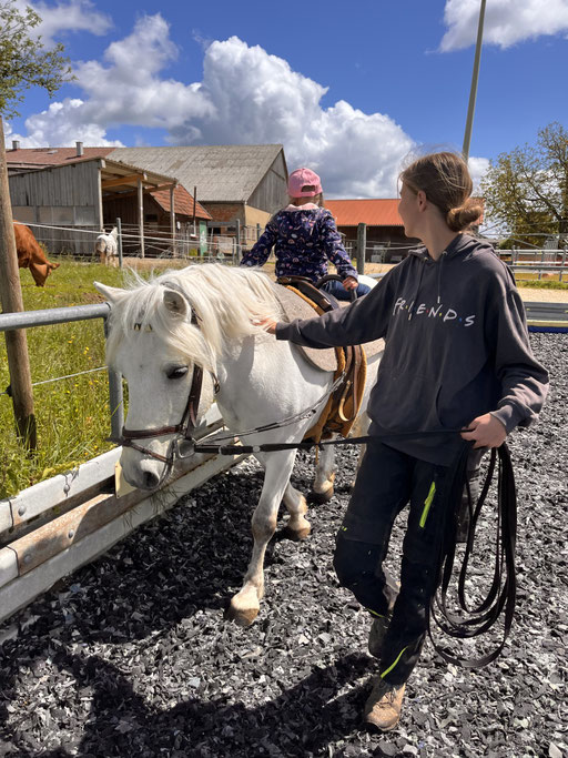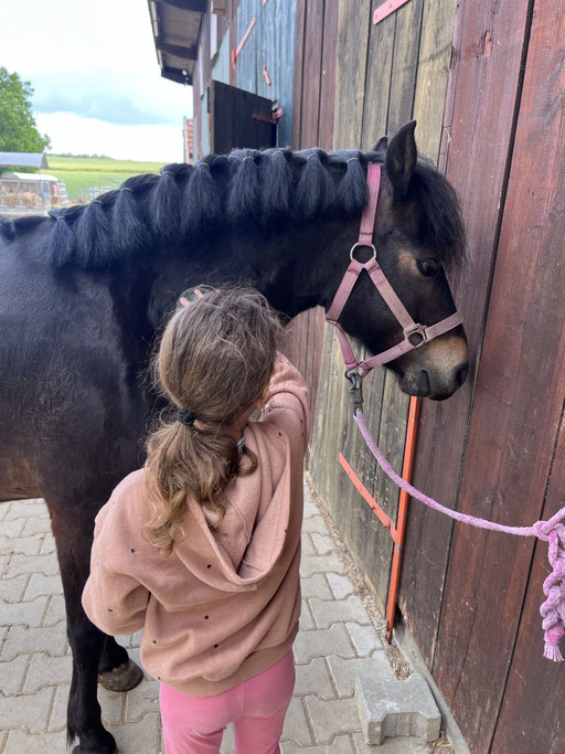 Spielerisch werden erste Voltiübungen geturnt, Bewegungsspiele gespielt und bei schlechtem Wetter lernen wir unsere Ponys zu pflegen, sie zu führen und vieles mehr.