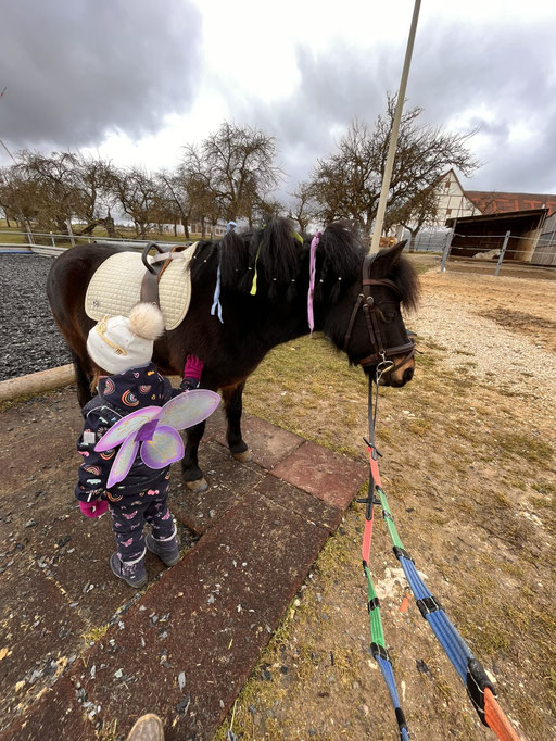 In einer kleinen Gruppe von ca. 6 Kids geht es darum Spaß an der Bewegung zu entwickeln und erste Erfahrungen auf und mit einem Pony zu sammeln.