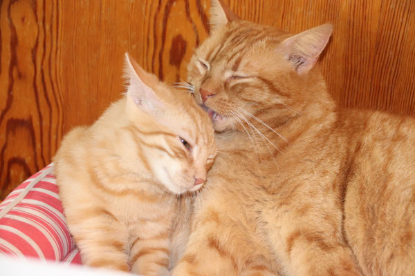 Mini liebt Pibo (die einzige Katze auf unserem Hof -seit Lillys Tod- die sowohl in´s Haus darf, als auch raus), er schaut sehr zu ihm auf und ist im völligen Glück, wenn Pibo sich mal zu Kuscheleinheiten herablässt...