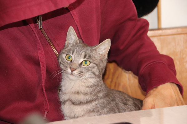 dieses kleine Wesen ist zusammen mit noname6 das Baby von noname1. Die beiden hatten sich zu Beginn super entwickelt und kamen eines Tages von Mutti begleitet (noname1) zu unserer Fütterung. Anfassen lassen war für beide völlig indiskutabel. Eines Tages mussten wir beobachte, dass die kleine graue nicht mehr gefressen hat und auch die Körperhaltung zeigte, dass mit ihr irgendwas gar nicht stimmt. ich hatte einige Versuche unternommen um an sie ranzukommen, aber sie wollte nicht - so mussten wir zuschauen wie sie immer schwächer wurde. Bei meinem letzten und dann auch erfolgreichen Versuch wog sie gerade noch 800g.